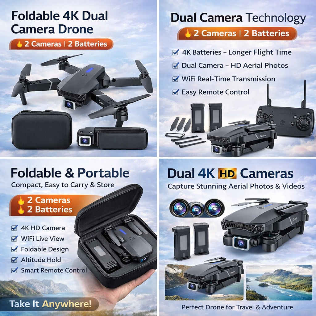 Be the first to review “Foldable 4K Dual Camera Drone with Remote Control | WiFi Live View | 2 Cameras | 2 Batteries | Portable HD Aerial Photography Drone”