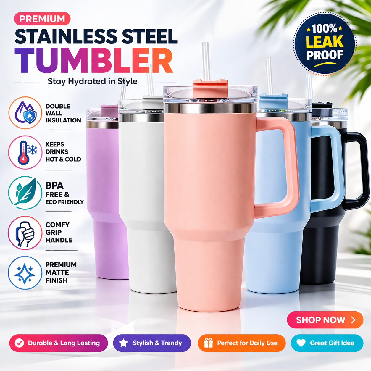 Premium Stainless Steel Insulated Tumbler 40oz (1200ml) | Leak Proof | Hot & Cold Bottle with Handle & Straw